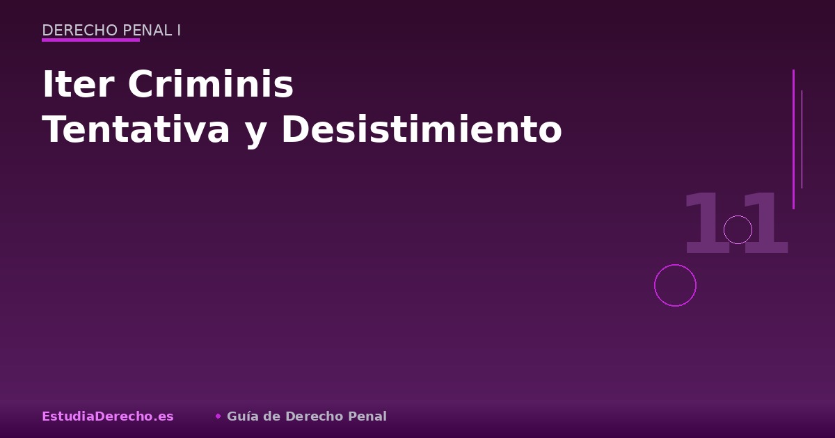 El iter criminis (camino del delito) es el proceso que recorre el sujeto desde que concibe la idea delictiva hasta que la consuma. Sus fases son: ideación → deliberación → resolución → actos preparatorios → actos ejecutivos (tentativa) → consumación → agotamiento.